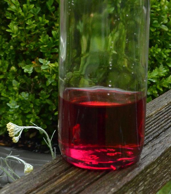 - Breng het rozenwater nog een keer aan de kook en giet het door flessentrechter met zeef of gebruik een neteldoek en vang het rozenwater op in een fles of meerdere flesjes. Laat het rozenwater verder in de fles afkoelen.