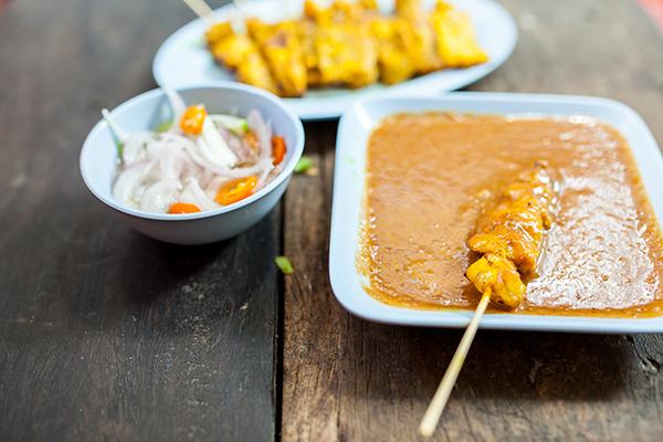 - Bak de ui, knoflook, trassi en kurkuma in een paar eetlepels olie. Voeg daarna alle andere ingrediënten toe. Breng de saus aan de kook. Blijf goed roeren tot de pindakaas volledig gesmolten is.