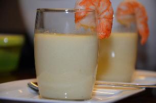Een velouté is een soep die gezeefd en daarna gebonden wordt met een mengsel van eierdooier of room en boter. Daarna wordt er een verfijnde garnituur aan toegevoegd zoals bijvoorbeeld gestoomde aspergepunten, dunne reepjes kipfilet, rivierkreeftjes, scampi of garnalen. Deze seldervelouté is perfect als voorgerechtje of amuse.