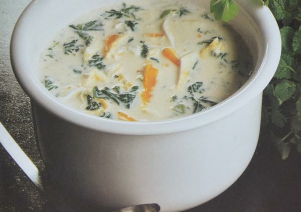 Een Italiaanse spinaziesoep, waar ik persoonlijk altijd perzik uit blik aan toevoeg.