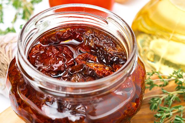 • Bewaren op olie? Vul een glazen weckpot tot 2 cm met gedroogde tomatenschijfjes. Leg er wat verse of gedroogde tijm of rozemarijn op en giet er wat olie op. Schud voorzichtig om de olie goed te verdelen en de lucht te laten ontsnappen. Leg opnieuw een laagje tomatenschijfjes en bouw zo verder op tot de weckpot vol is. Druk alles goed aan en sluit de weckpot goed.