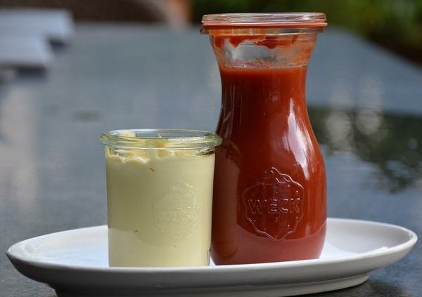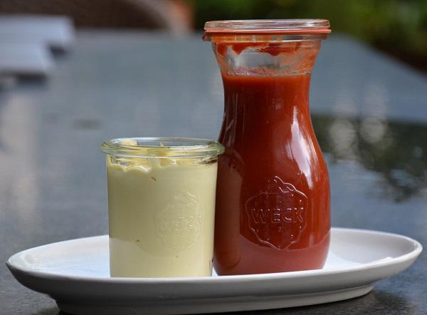 - Wij gebruiken altijd sapflessen van 1/4 liter omdat sapflessen veel gemakkelijker uitschenken. Om de ketchup te bewaren in de koelkast gebruikt u de vershouddeksels. Doordat het zo mooi op tafel staat, hebben wij ook mayonaise in een inmaakglas van 160 milliliter gedaan. (zie foto) Ook dit weckpotje kan met een vershouddeksel afgesloten worden.