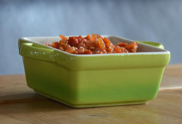 Deze tomatenrelish is heerlijk bij een hamburger of op een stukje vlees of vis.