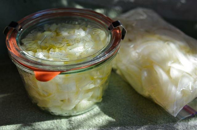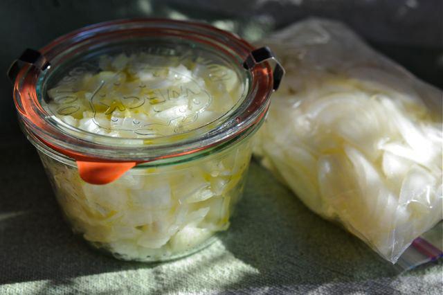 De uien pelt u en snijdt u fijn. Dompel ze dan even in een klein beetje olijfolie om ijsvorming in de diepvries te voorkomen. Daarna vult u een weckpotje met de fijngesneden uien en sluit de weckpot af met de inmaakring en de weckklemmen of u kunt gebruik maken van de vershouddeksel van WECK.