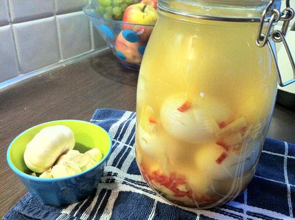 In de pan van het vlees bak je 1 van de versnipperde uien. |