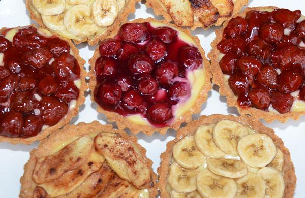 - Schep de banketbakkersroom in de taartjes en leg hier vers fruit op zoals: aardbeien, banaan, kersen, appels, kiwi.