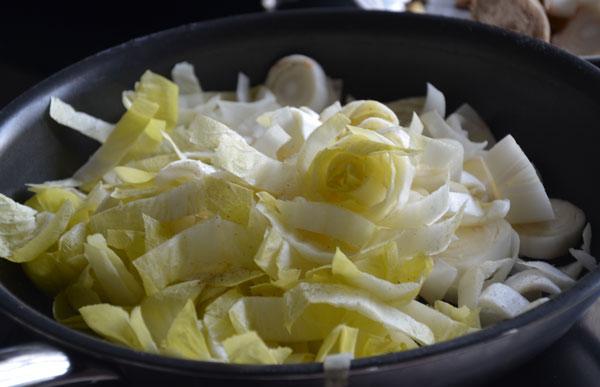 - Voeg de witlof toe en kruid met behoorlijk veel vers gemalen zwarte peper.