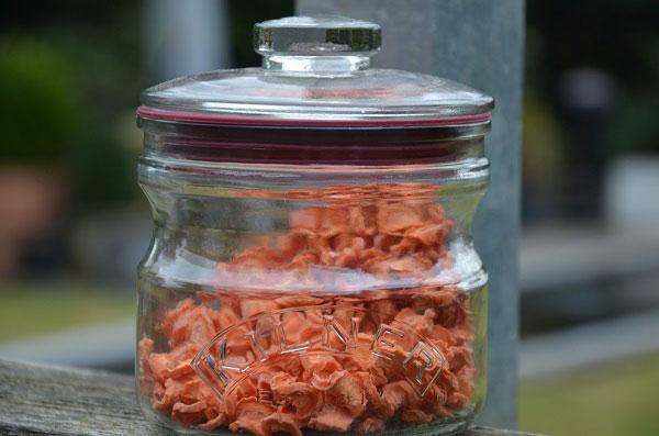 - Bewaar gedroogde wortelen altijd in het donker of gebruik kruidenpotjes met donker glas. Deze zijn er in alle maten. Als u gedroogde wortelen in het licht bewaard zullen deze snel verkleuren en zal vitamine A verdwijnen uit de wortelen.