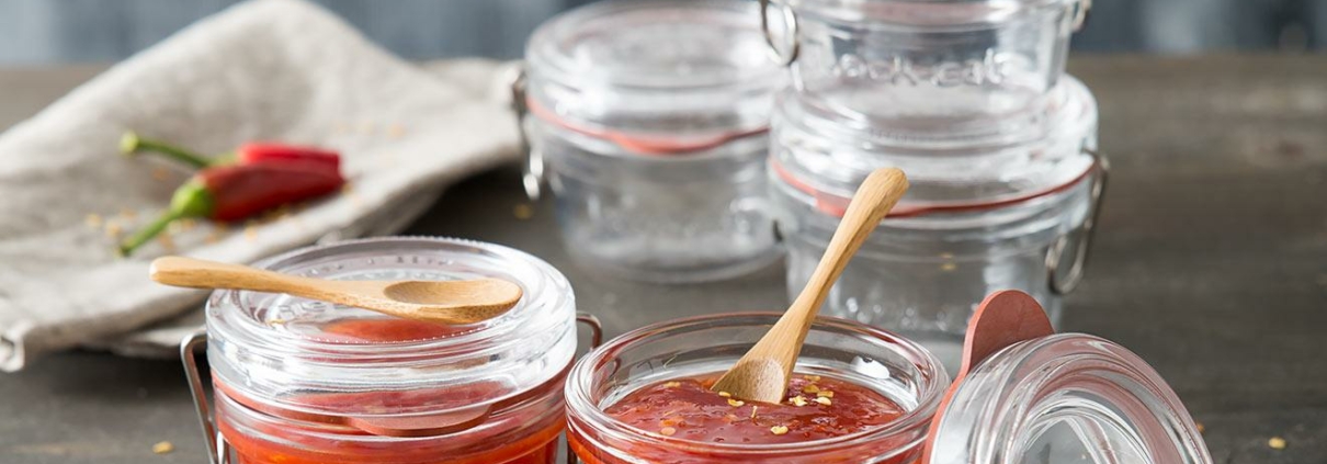• Schep de saus in gesteriliseerde weckpotten of jampotten. Laat de saus volledig afkoelen alvorens het koel te bewaren in de koelkast.