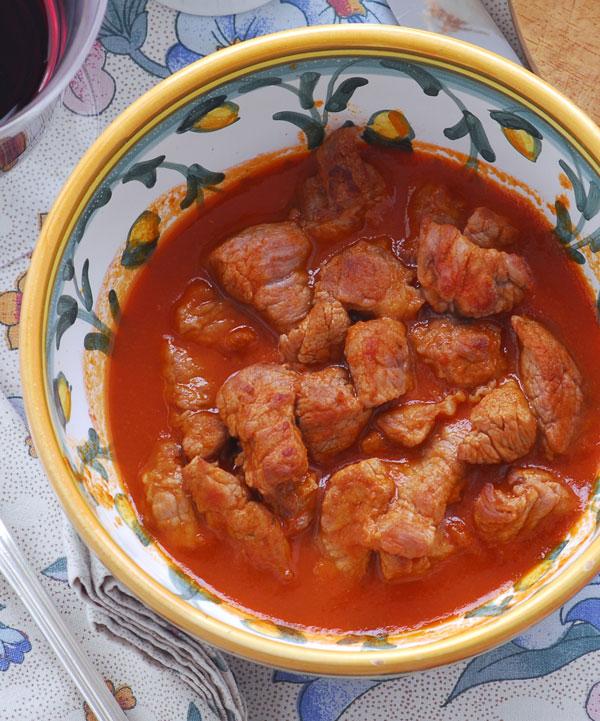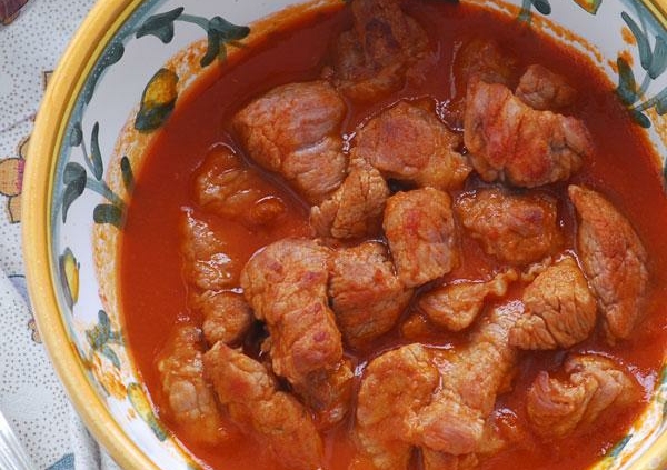 - Pel en versnipper de uien. Als het vlees nog niet klein gesneden is snijd het dan in blokjes van ongeveer 2 x 2 cm.