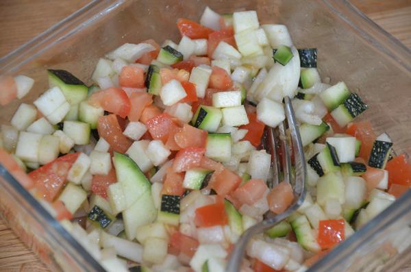 • Meng de tomaat, courgette, ui en knoflook onder de kruidenmengeling.