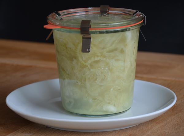 • Laat de pot op het bord staan want er kan altijd nog vloeistof uitlopen. Waarschijnlijk komt u nu water tekort. Kook wat water en laat dit afkoelen. Voeg dat toe aan de uien en vul de pot tot de rand. Sluit de weckpot met de inmaakring en 4 klemmen en zet deze op een koele plaatst. Hierdoor stopt het fermentatieproces en ontwikkeld de specifieke smaak van gefermenteerde uien.