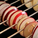 Schuif de appelschijfjes op de satéprikkers en verdeel ze over de roosters van de oven.