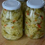 Vul gesteriliseerde jampotten zo vol mogelijk met de fijngesneden groenten. Duw de groenten goed aan. Vul de jampotten verder aan met het gekookte azijnmengsel. Sluit de jampotten goed af en laat volledig afkoelen.