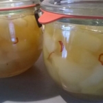 Schep de perenstukjes met behulp van een schuimspaan uit de pan en verdeel ze over de weckpotten.