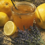 Roer op een laag vuur de geleisuiker door het sap tot de suiker opgelost is. Voeg het kruidenzakje met de gedroogde lavendelbloemen toe en breng het mengsel opnieuw aan de kook tot de confituur voldoende gestold is.