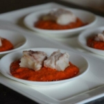 Verwijder het vel en de graten van de makreel. Leg 2 kleine stukjes makreel bovenop de paprikacreme.