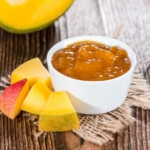 Stamp de mangostukken fijn. Voeg de geleisuiker toe en breng de confituur opnieuw aan de kook. Laat het 3 minuten goed doorkoken tot de confituur voldoende gestold is.