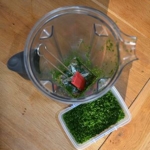 Doe de peterselie in de kom van de Vitamix en neem de stamper. Zet de vitamix op snelheid 1 en verhoog deze langzaam naar snelheid 4. Duw met de stamper de peterselie naar beneden.