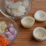 Snijd het kopje van de raapjes af, of snijd ze in de lengte doormidden, en hol ze uit. Hak het vruchtvlees van de raapjes in kleine stukjes.