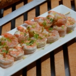 Pers de knoflookteentjes en leg de prikkers met scampi op een bordje.