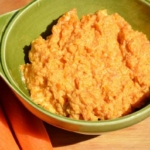 Mix de wortelen, olijfolie, citroensap, paprikapoeder, korianderpoeder en het knoflookteentje tot een gladde moes.